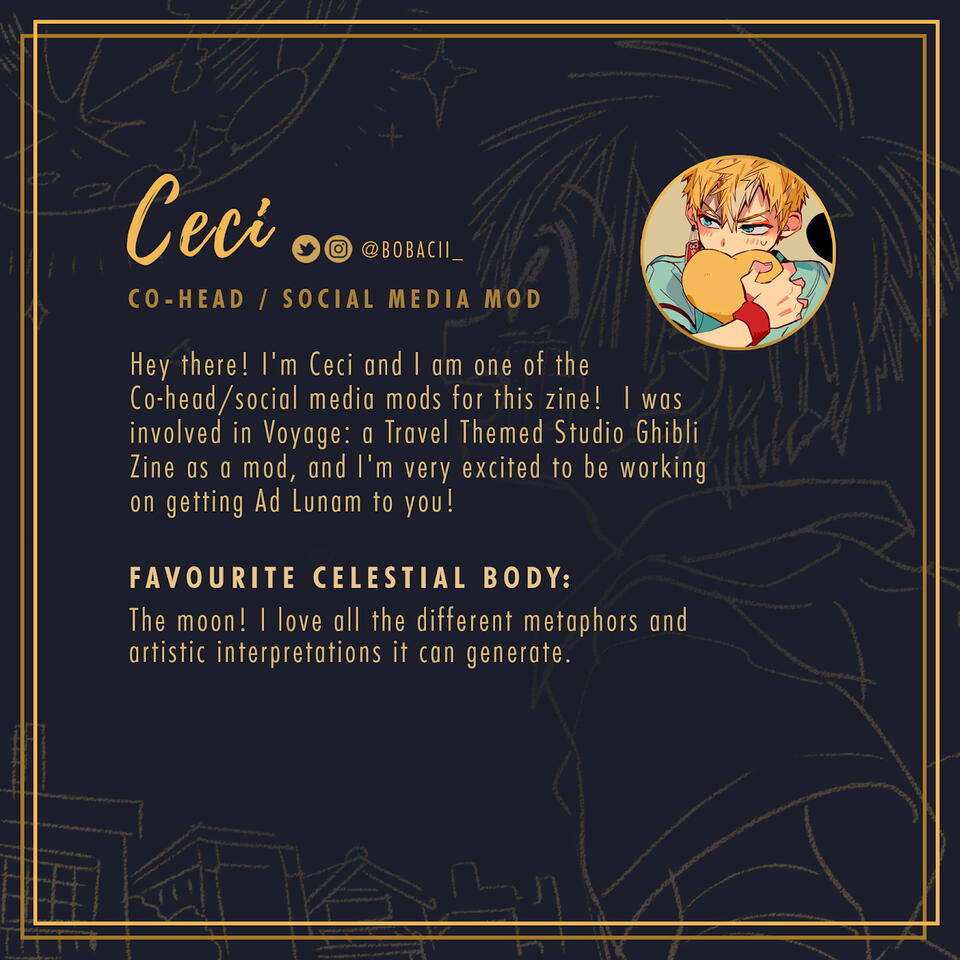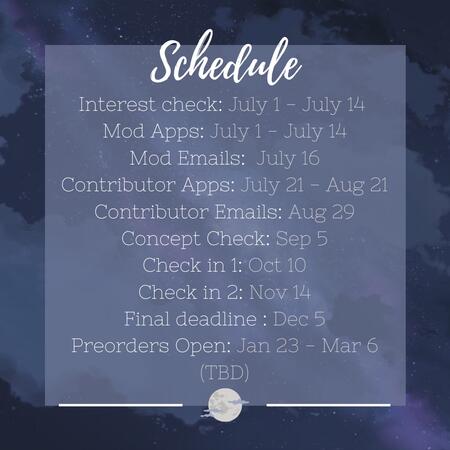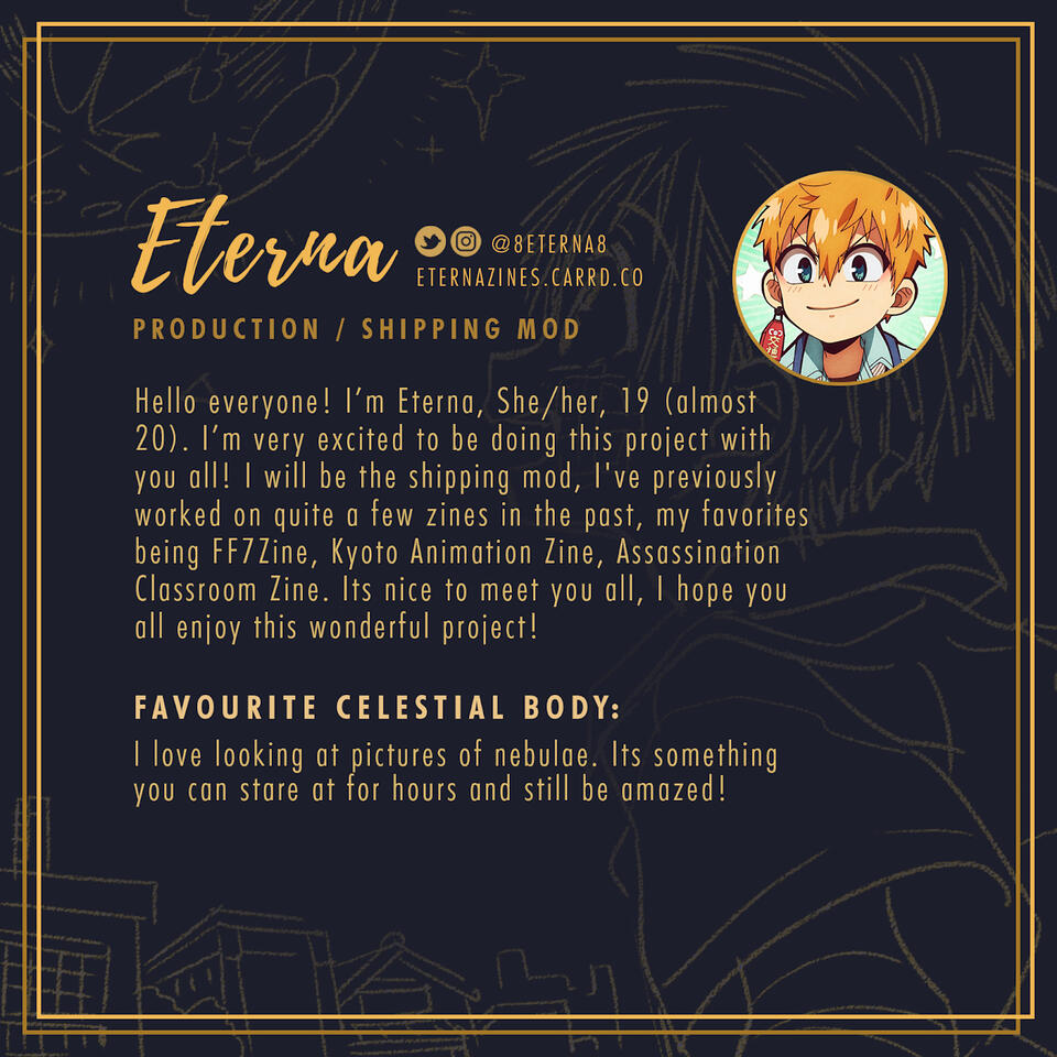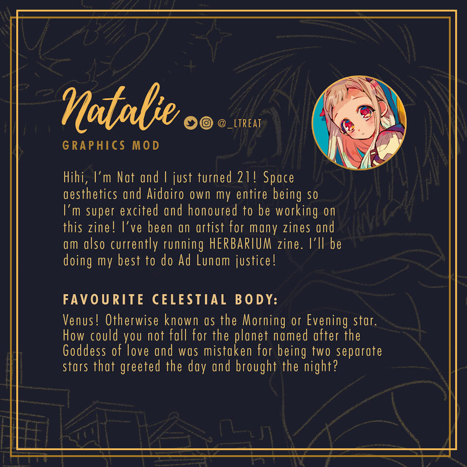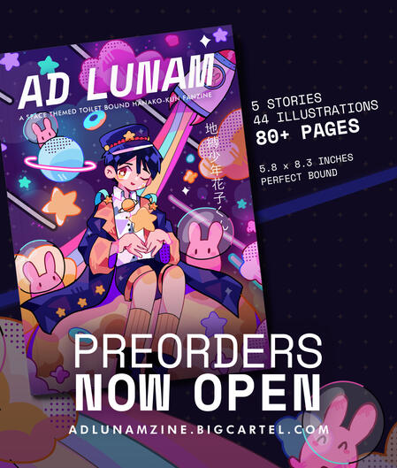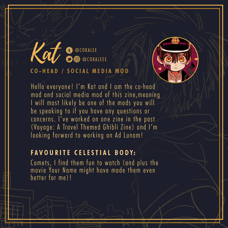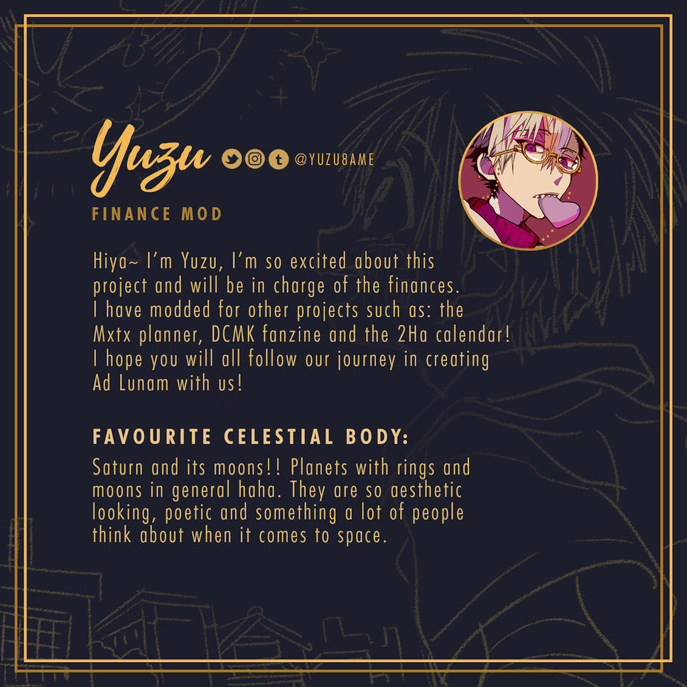 We are excited to bring you the mod team for Ad Lunam: A Space Themed JSHK Zine! To access higher quality images and links to all the mods' social medias, the link to our tumblr is available below.